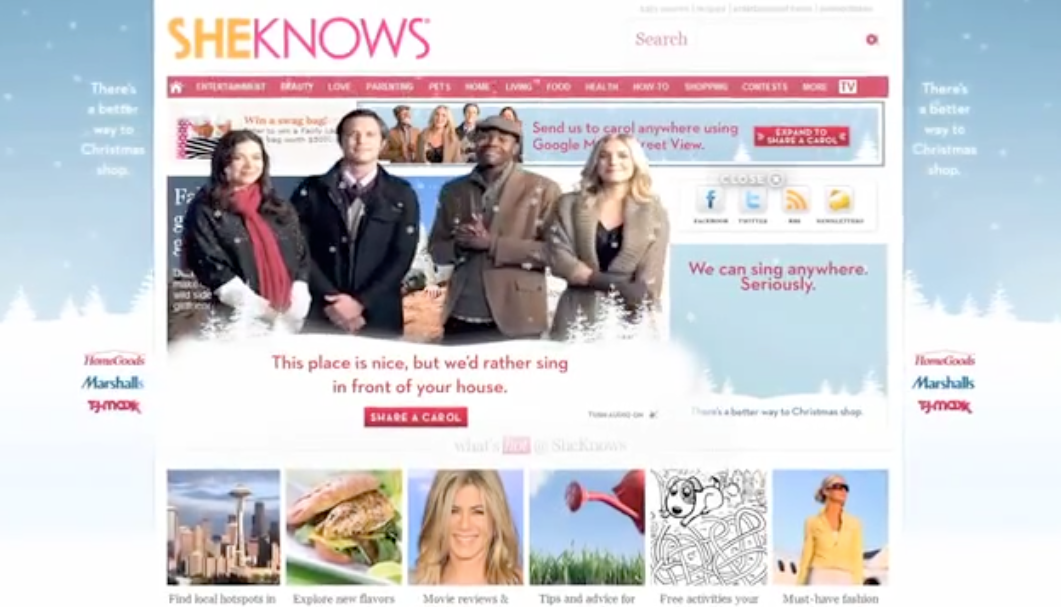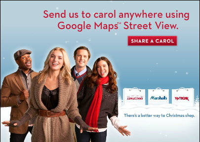 We were asked to create a digital experience for Marshalls consumers for the Christmas season. We came up with Share-A-Carol. Tying into the caroler TV campaign, the website allowed the user to send a custom caroler to any house via Google street view. We used social media, TV, and web banners to push the site.